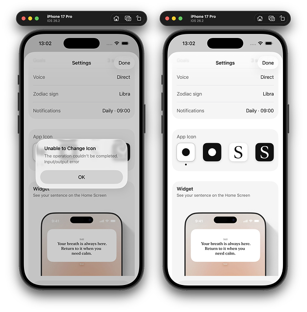 The biggest surprise for me was the Apple Developer account. I thought I could delay it. You can’t, not if you want widgets and notifications to behave like reality.